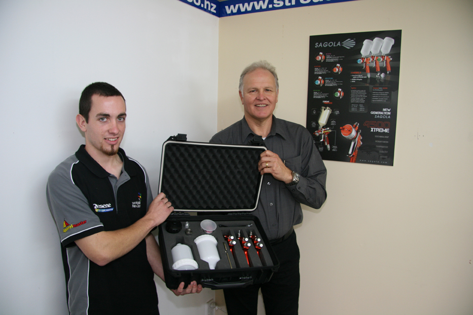 Joshua Fistonich, World Skills New Zealand winner, to use SAGOLA spray guns in World Skills International finals in Germany 2013 Joshua Fistonich is a young man that recently won the New Zealand World Skills in Automotive Refinishing and he will use SAGOLA sprayguns in the final in Leizpig (Germany) . After winning the regional competition in Auckland, the national competition, sponsored by Resene Automotive and Light Industrial, was held at CPIT Trades Innovation Institute. Their trainers Roger Hiini, from Resene Automotive and Light Industrial, and Jason Lynch, from SAGOLA’s New Zealand importer WA STROUD, are very proud of the job done by Joshua. He is now working in a panel beating shop in Orewa, Auckland, where he will go on training with SAGOLA equipment to do his best in World Skills International finals. First time Joshua tested SAGOLA 4500 Xtreme he said, “I used the LXT CLEAR cap and was blown away, the way it flows and sprays. It just works wonderful. I was walking round the shop with a huge smile on my face and everyone else was laughing”. World Skills International final will be held in Leipzig, Germany, in July 2013. We wish Joshua all the best for the finals! Good luck Josh! To find more information about World Skills, please log on to: http://www.worldskillsspain.es/