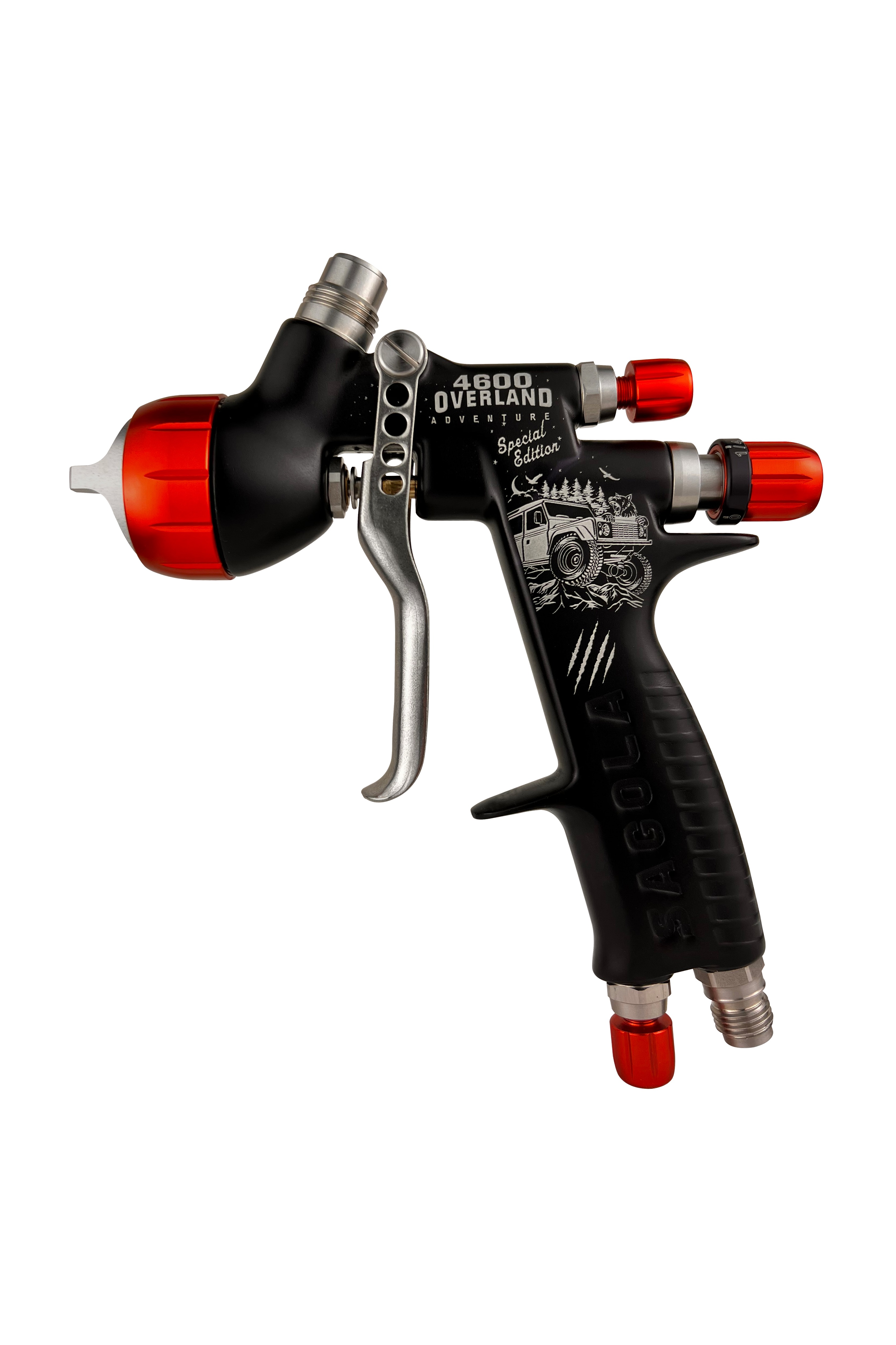 Welcome to Sagola's new special edition 4600 Overland Adventure. Designed to replace the successful 4600 Trophy Truck, this gun features different fluid tips, including the 1.2, 1.2XL, 1.3, 1.3XL, 1.4 and the Titania Pro aircap, which is highly appreciated by professional painters due to its large fan and mirror finish, especially suitable for fast drying and last generation clears.
